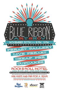 Which takes us to the Rock and Roll Hotel last night for the Blue Ribbon Art Show. Sponsored by BloomBars, a “training ground for a new generation of change agents” but really a non-profit community arts space, the top floor bar area was full of PBR-themed art. There was a Sistine Chapel-type PBR painting, a landscape PBR, a Jackson Pollock PBR, a Lichtenstein PBR, a dinosaur PBR, and a trippy Dumbo-inspired PBR. And of course, if looking at all that two-dimensional PBR makes you thirsty, there are $2 tall boys on sale at the bar.