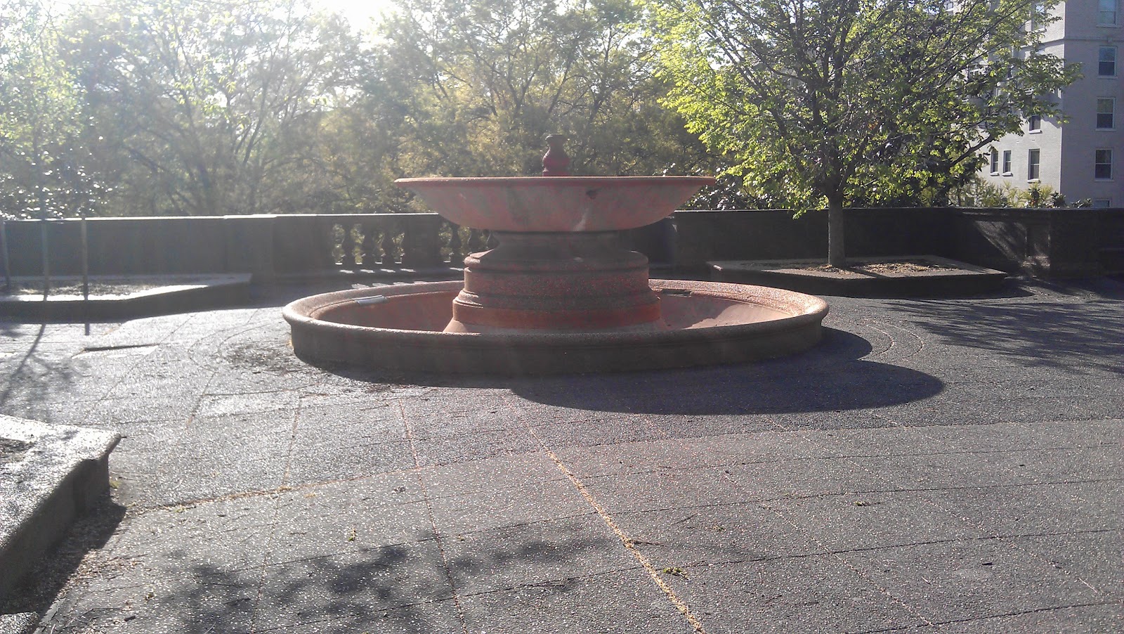One last interesting thing to note about this statue before we move on: parallel to Ms. Arc, at the outer edges of the park, are two fountains of curious architectural design: