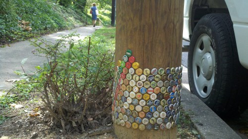 Is it art, or was someone with a nail gun bored? While it must have been the result of prior planning, still there is a delightful sense of whimsy here. How many bottlecaps go to waste, when these are living the life. I esspecially like the random[?] interplay of primary colors next to the grass and cement and wood.