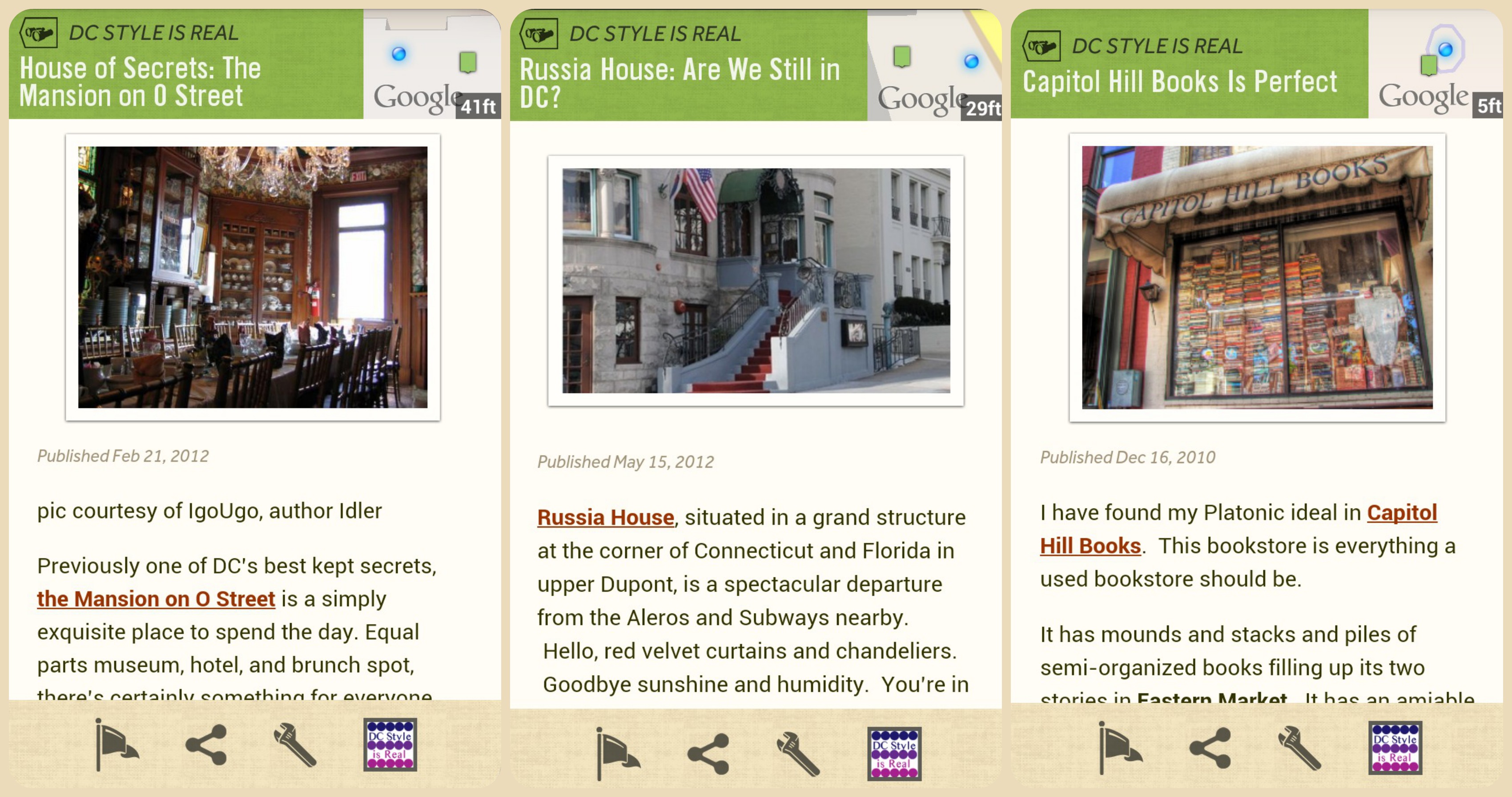 Posts from DC Style Is Real can now appear wherever you go when you, once you’ve downloaded the app, that is, walk around DC. Instead of digging into the archives of the blog, you can find stories by location. Set the app to follow your location and turn day-to-day life in DC into something more akin to a staycation.