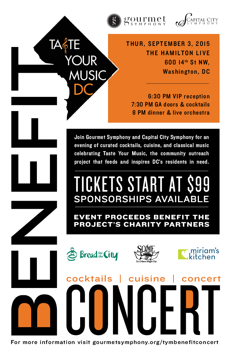 Gourmet Symphony and Capital City Symphony co-host a celebratory evening of curated cocktails, cuisine, and music benefiting Taste Your Music, the community outreach project that feeds and inspires DC’s residents in need. A portion of the event’s proceeds benefit Bread for the City, Miriam’s Kitchen, and So Others Might Eat.
